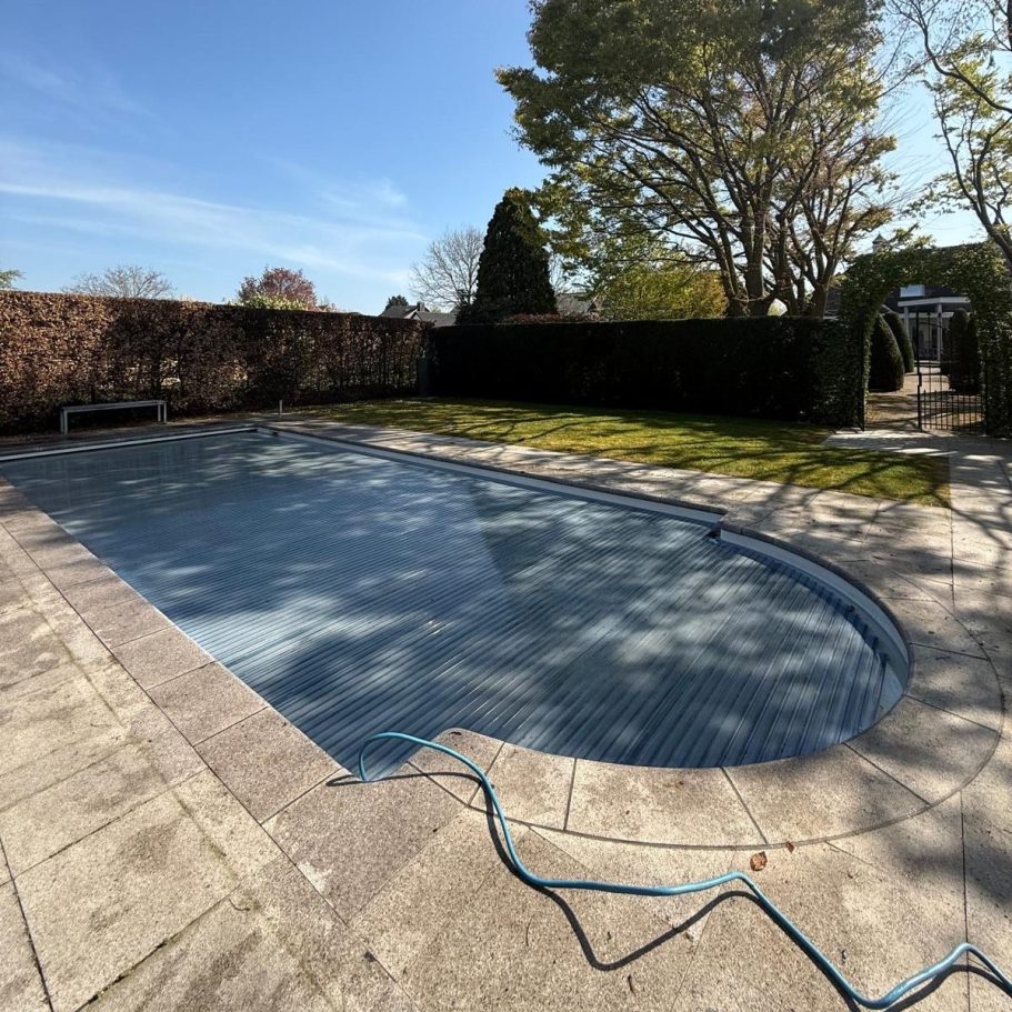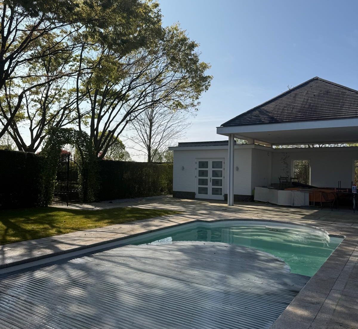 Het zwembad is voorzien van een automatische afdekking die eenvoudig te bedienen is. Deze beschermt het water tegen vuil en zorgt tegelijk voor extra veiligheid.