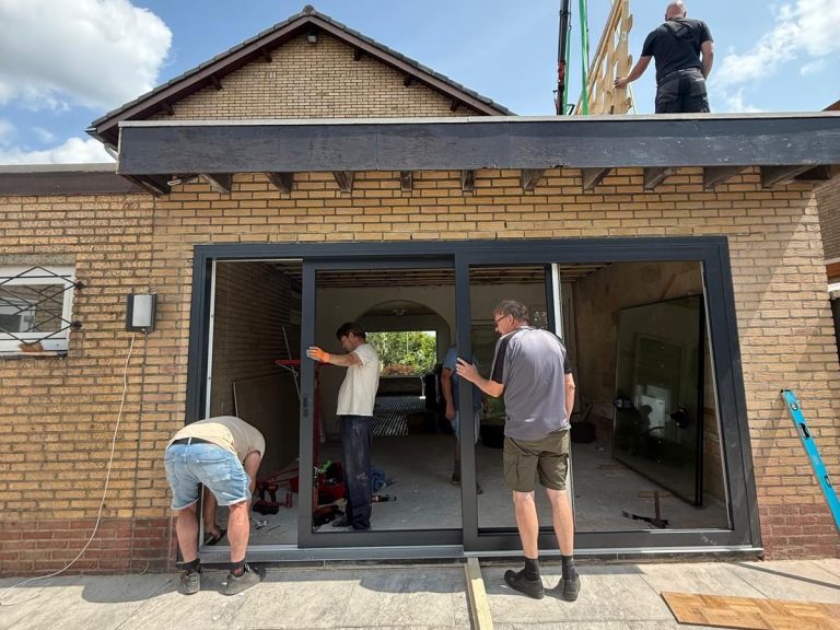 Een moderne schuifpui die de woonkamer naadloos verbindt met de tuin en extra licht en ruimte creëert.